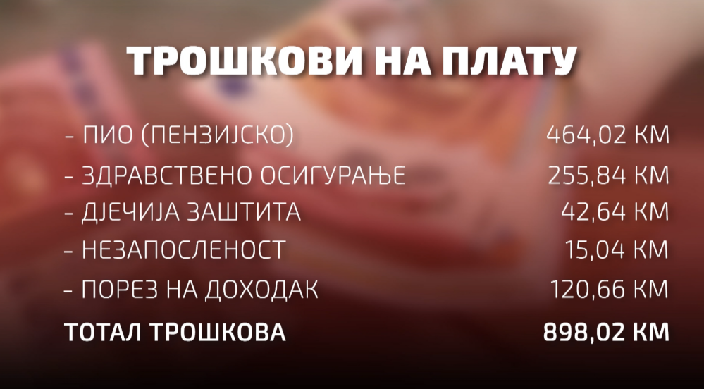Na platu od 2.500 KM, samo za penzijsko osiguranje mjesečno vam ode 464,02 marke. Zdravstveno vas košta još 255,84 KM. A onda ide i ostatak računa: desetine maraka za dječiju zaštitu, osiguranje za slučaj nezaposlenosti i porez na dohodak. Ukupno, skoro 900 maraka mjesečno ode državi, prije nego što vi uopšte vidite svoju platu.