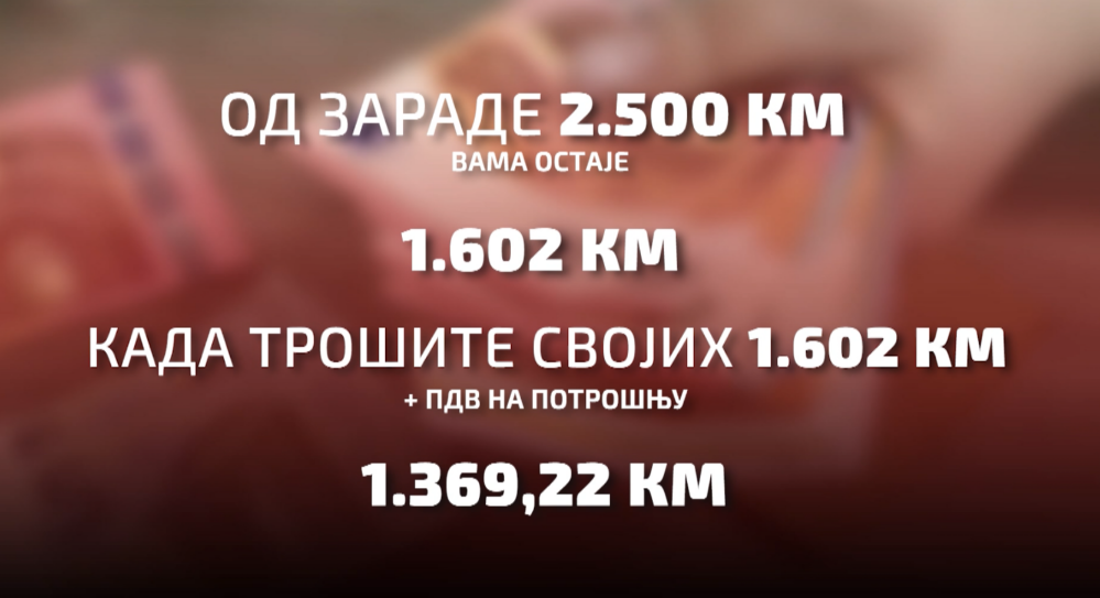 Od zarade 2.500 maraka vama ostane 1.602 maraka. Kada trošite tih svojih 1.602 KM plaćate na sve PDV tako da vam je čista zarada 1.369,22 marke.