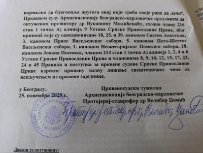 Iako su pomenuti teolozi koji su otvoreno stali na stranu studenata, a protiv režima u Srbiji, odlukom Patrijarha Porfirija prije suđenja bili iskqučeni iz liturgijskog života sa zabranom pričešća, sada je uslijedila još drastičnija odluka Suda.