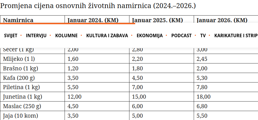 Navedene cijene predstavljaju prosječne tržišne cijene u većim trgovačkim lancima u Bosni i Hercegovini i služe kao ilustracija kretanja troškova života.
