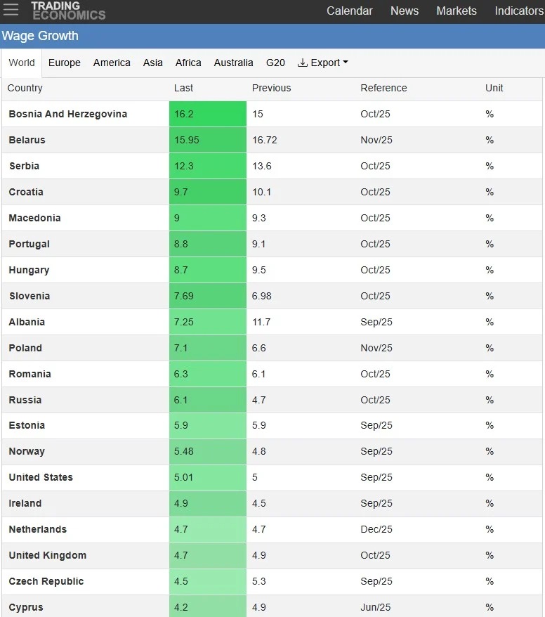 Time su zemlje Zapadnog Balkana i šire regije ubjedljivo nadmašile razvijene ekonomije, uključujući Sjedinjene Američke Države, gdje je rast plata iznosio oko pet posto, te brojne zemlje Evropske unije, prema podacima stranice Trading Economics.