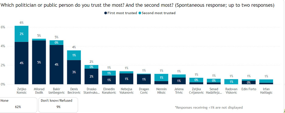 Ipak, za Željka Komšić je šest posto kazalo da ima povjerenja u njega, za četiri posto je bio na prvom mjestu, a na drugom mjestu dva posto. Za pet posto ispitanih je Milorad Dodik bio političar u kojeg imaju najviše povjerenja.