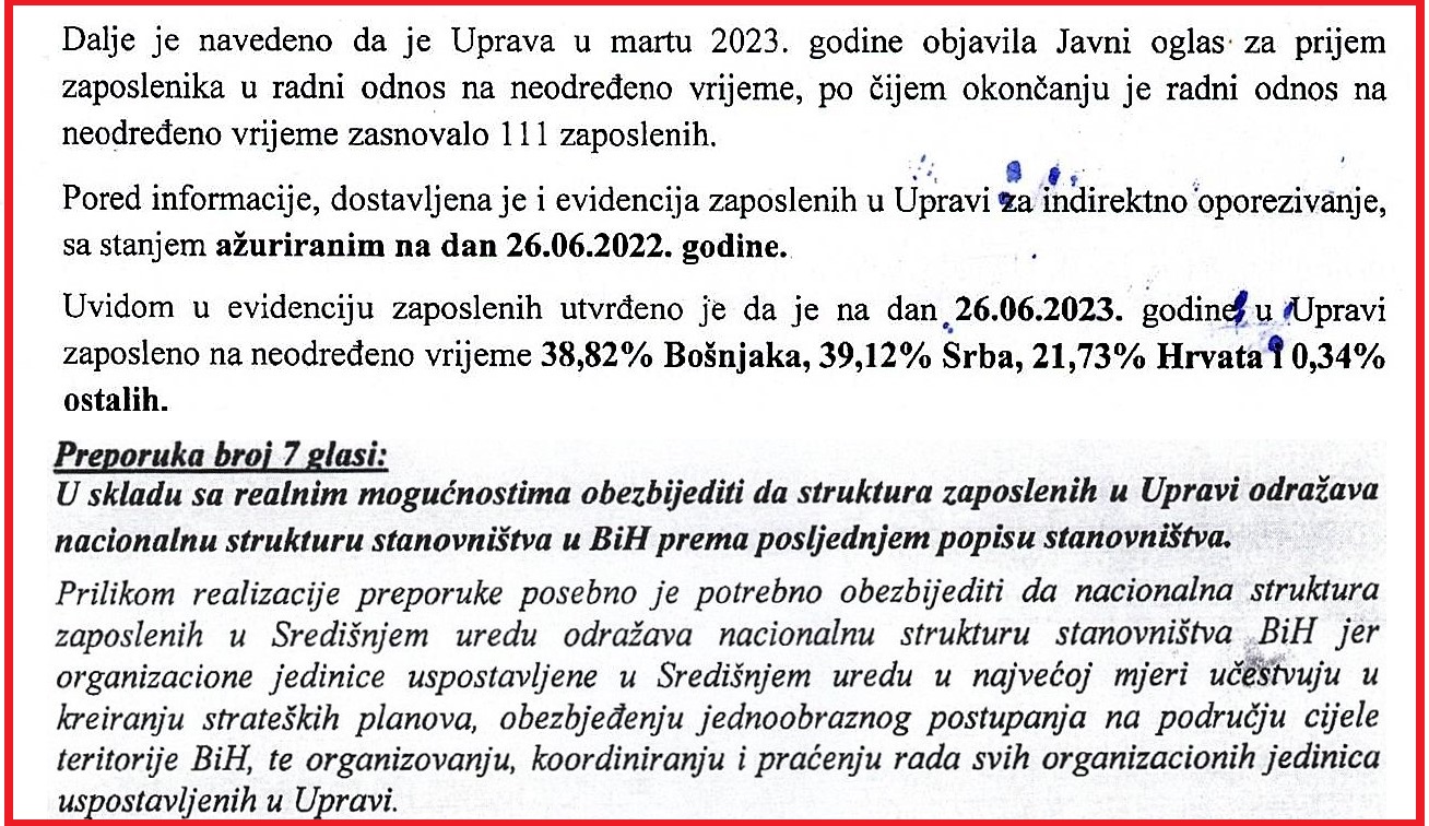 „Uvidom u evidenciju zaposlenih utvrđeno je da je na dan 26.06.2023. godine u UIO ukupno zaposleno 38,82 posto Bošnjaka, 39,12 posto Srba, 21,73 posto Hrvata i 0,34 posto ostalih“, navedeno je u Izvještaju tima za internu reviziju.