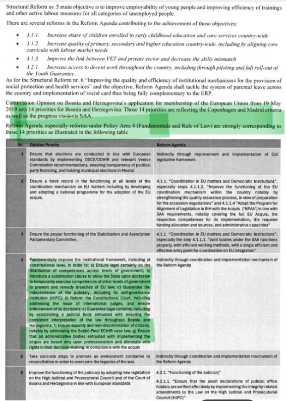 Glasajući nedavno za Reformsku agendu pristali su na dalji prenos nadležnosti u oblasti pravosuđa. Reformska agenda, dostavljena ministrima u Savjetu ministara BiH na engleskom jeziku koja se i dalje krije od javnosti, predviđa uvođenje Vrhovnog suda BiH. Ovo tvrdi profesor ustavnog prava Milan Blagojević i kao dokaz nudi fotografiju jedne od stranica pomenutog dokumenta.