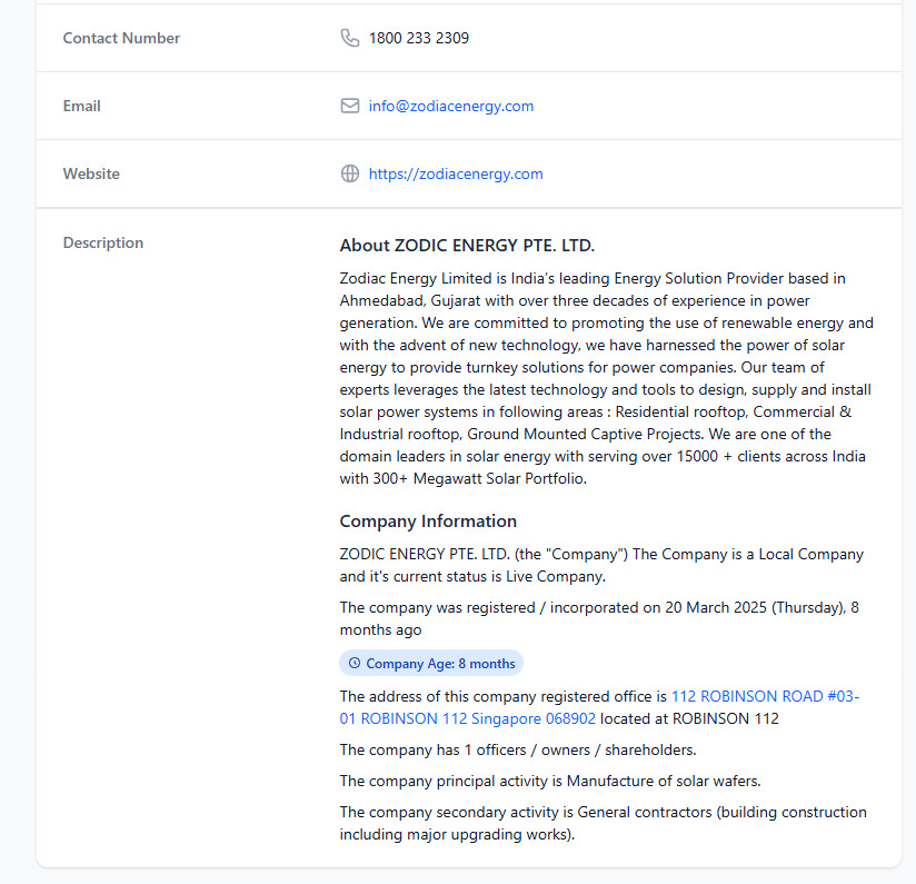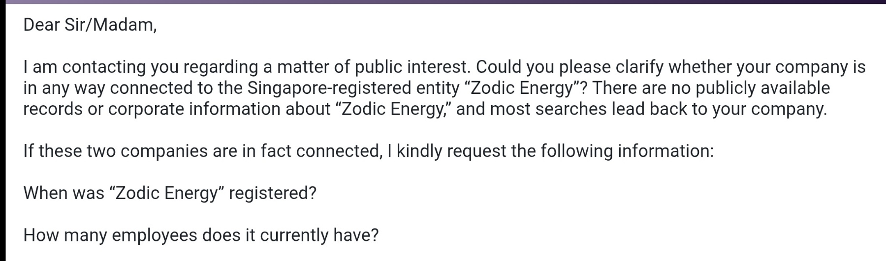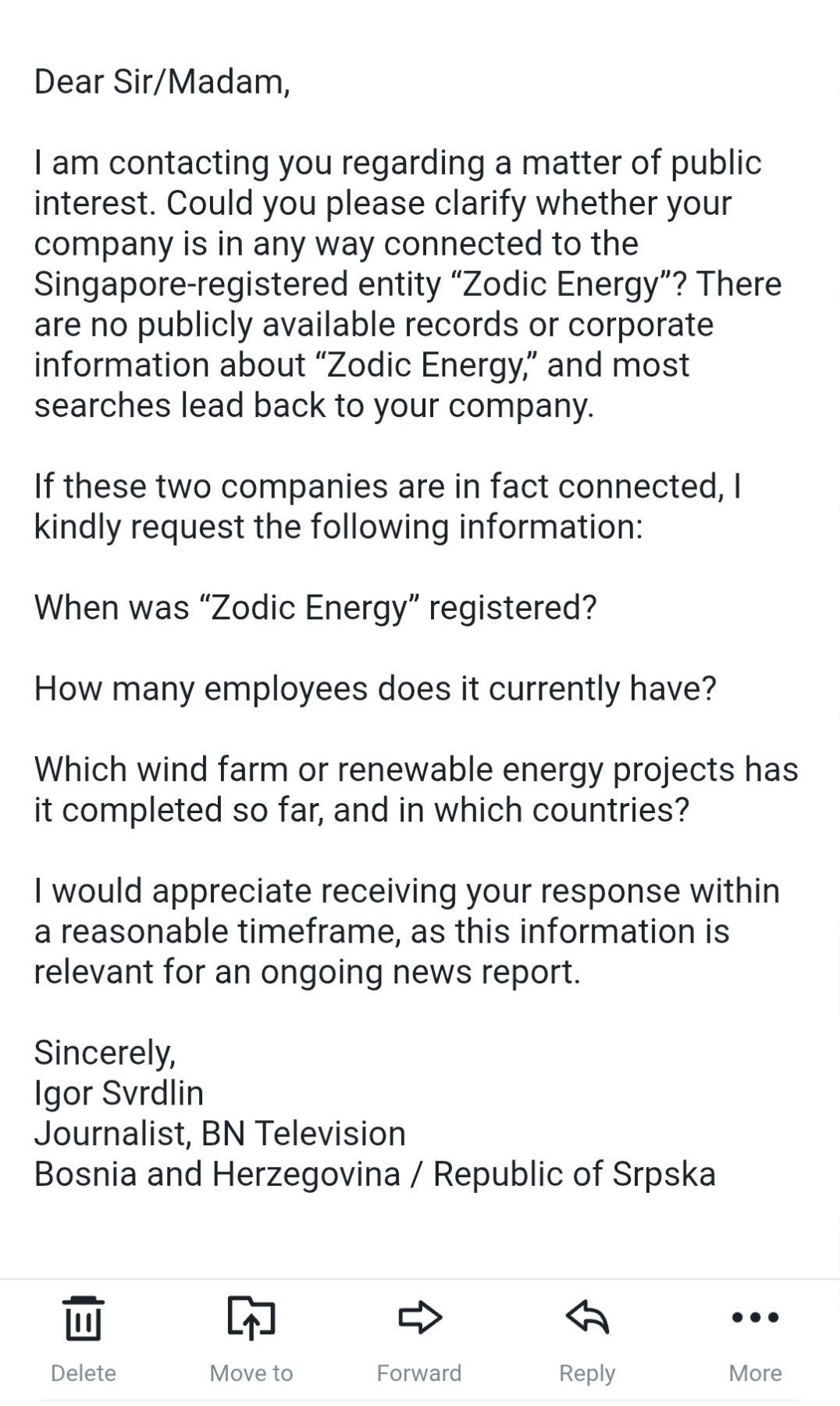 O dosadašnjim poslovima i projektima singapurske firme ‘‘Zodic energy‘‘ nema javno dostupnih informacija.
