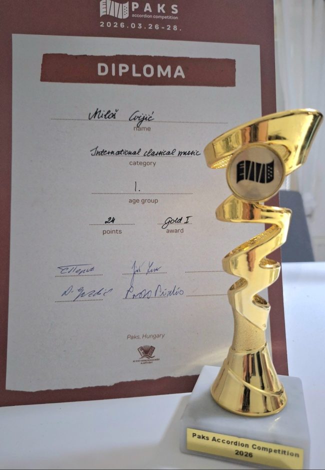 -Presrećan sam zbog osvojenog prvog mjesta. Volim harmoniku i svaki dan vježbam kako bih bio što bolji. Ovo priznanje mi daje još veću motivaciju da nastavim da radim i napredujem. Zahvalan sam svom profesoru i porodici na podršci-rekao je Cvijić.