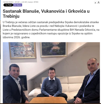 Interesantno je da vijest o sastanku prenosi režimski RTRS, koji slične sastanke obično ignoriše, kao i izjavu Vuaknovića u kojoj je naveo da „SDS kao najveća opoziciona stranka prije četiri godine je napravila veliki ustupak i prepustila kandidaturu za predsjednika Republike Srpske PDP-u, i jasno da se sada ne može napraviti takav ustupak, jer bi to bio veliki udarac za SDS, doveo bi do velikih potresa i nezadovoljstva u članstvu, koji insistira da profesor Blanuša bude kandidat, posebno nakon odličnog rezultata prije par mjeseci, pa je pitanje koji je argument zašto se sada nećkaju i zašto ga ne žele bezuslovno podržati lideri opozicionih stranaka koji su prije par mjeseci bili u kampanji Branka Blanuše.“