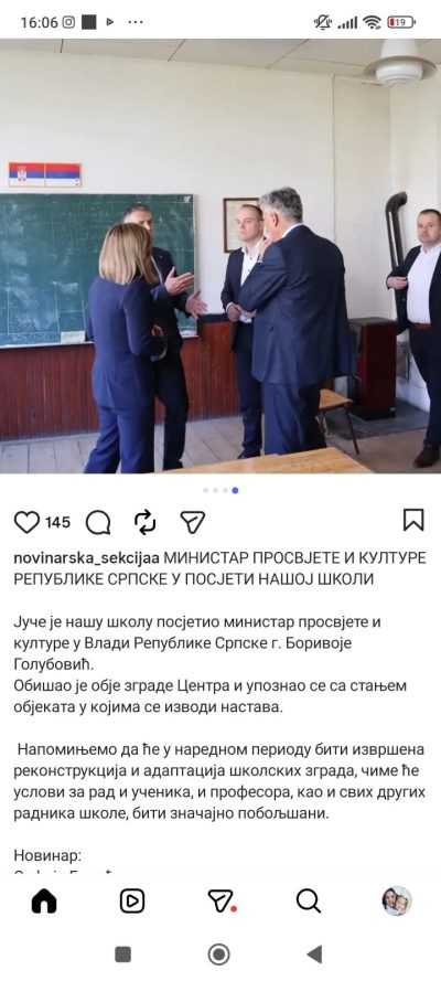 U vijesti se navodi da je ministar prosvjete i kulture Republike Srpske Borivoje Golubović posjetio Osnovnu školu „Risto Proroković“ i Srednjoškolski centar „Aleksa Šantić“ u Nevesinju.