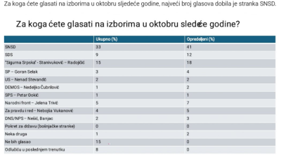 Tako je SNSD, prema rezultatima istraživanja, dobio 41 posto opredjeljenih, dakle kada se izbaci procenat neodlučnih ili onih koji su odbili da odgovore. Pokret „Sigurna Srpska“ Draška Stanivukovića bi osvojio 18 posto, a SDS 12 posto. Što znači da bi Draško Stanivuković preuzeo lidersku poziciju opozicije od SDS.