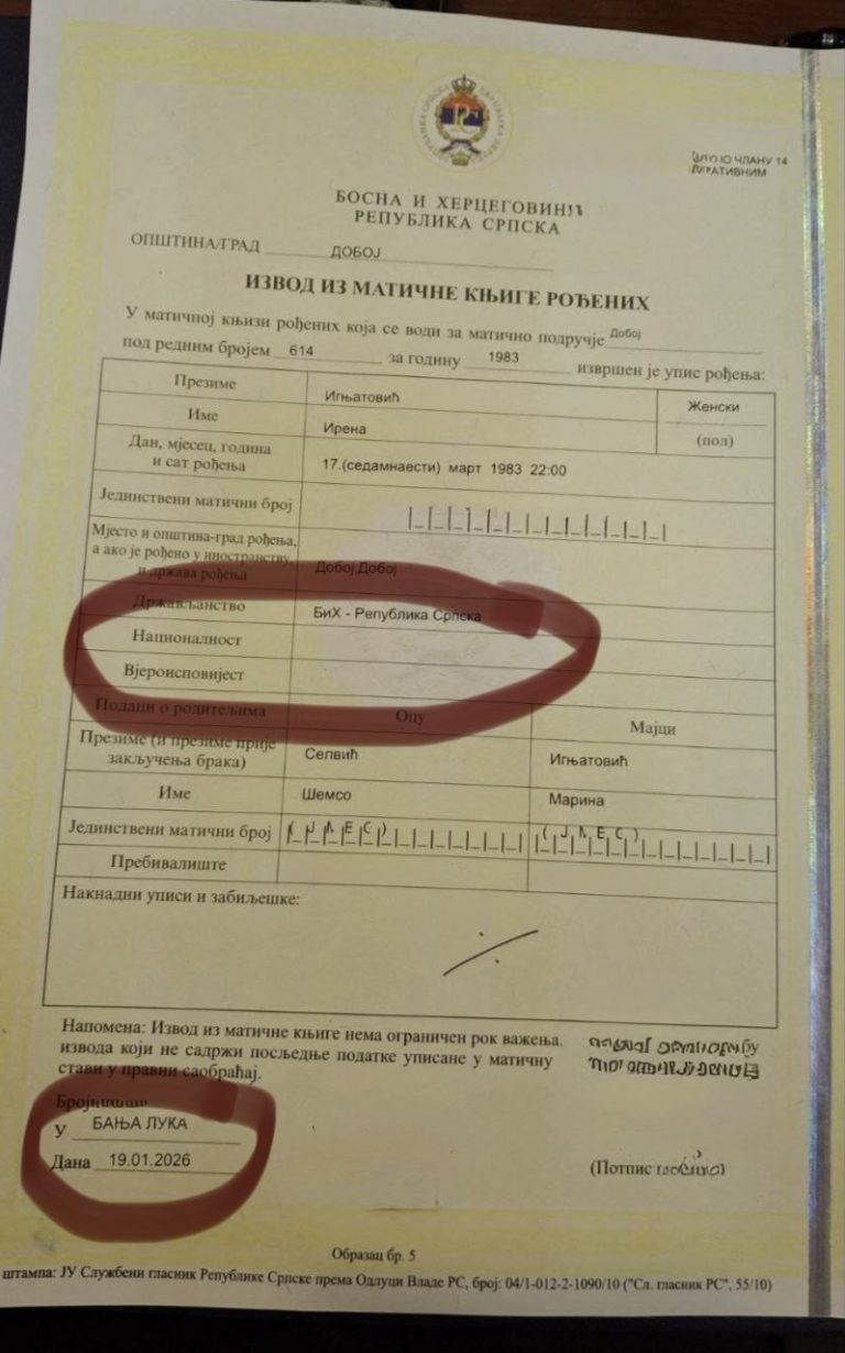 Naš portal je u posjedu njenog rodnog lista koji je izdat danas, a rubrike nacionalnost i vjeroispovijest u rodnom listu su – prazne, tako da kao jedini dokaz nacionalne pripadnosti služi njena izjava.