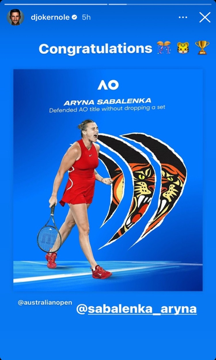 „Čestitam“, poručio je Novak, na šta mu je Sabalenka odgovorila sa „hvala“.